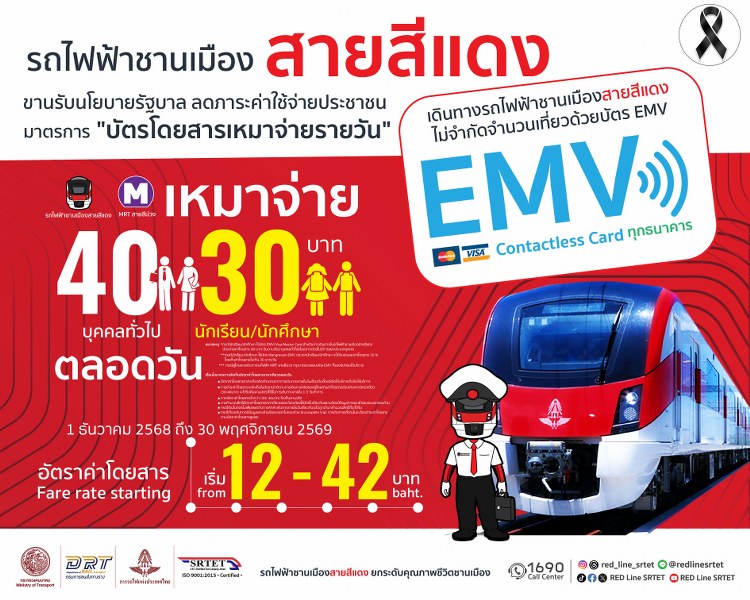 บริษัท รถไฟฟ้า ร.ฟ.ท. จำกัด ผู้ให้บริการรถไฟฟ้าชานเมืองสายสีแดง ดำเนินมาตรการ “บัตรโดยสารเหมาจ่ายรายวัน” สูงสุด ไม่เกิน 40 บาท ลดภาระค่าใช้จ่ายประชาชน ตามนโยบายรัฐบาล เริ่ม 1 ธ.ค. 68