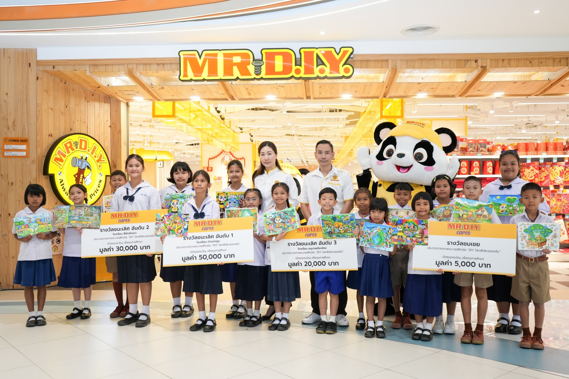 | กรุงเทพฯ – 20 มกราคม 2569 – บริษัท มิสเตอร์. ดี.ไอ.วาย. โฮลดิ้ง (ประเทศไทย) จำกัด (มหาชน) ผู้นำธุรกิจค้าปลีกอุปกรณ์ตกแต่งบ้านและสินค้าไลฟ์สไตล์ เดินหน้าสนับสนุนการศึกษาพร้อมพัฒนาเด็กและเยาวชนไทยอย่างต่อเนื่อง จัดพิธีมอบรางวัลเพื่อทุนการศึกษาและเกียรติบัตรแก่นักเรียนผู้ชนะจากกิจกรรมประกวดวาดภาพระบายสี ภายใต้หัวข้อ “DIY โลกสีเขียวของฉัน” ซึ่งจัดระหว่างวันที่ 15 ตุลาคม พ.ศ. 2568 ถึง วันที่ 28 พฤศจิกายน พ.ศ. 2568 ในโอกาสนี้ คุณฐิตานันท์ ซุน รองประธานกรรมการบริหาร และคุณอานุภาพ คงมาลัย รองประธานบริหารฝ่ายการตลาด ร่วมมอบรางวัลให้แก่นักเรียนจาก 19 โรงเรียน รวมมูลค่าบัตรกำนัลเพื่อทุนการศึกษาทั้งสิ้น 200,000 บาท |
