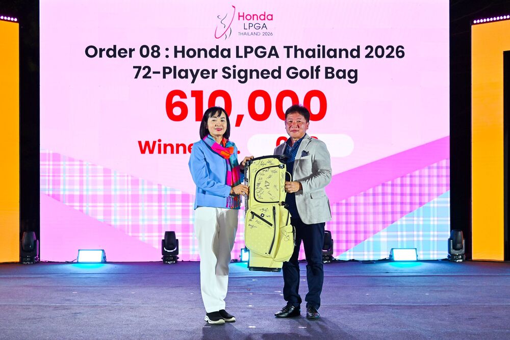 มร. โทชิโอะ คุวาฮาระ (ขวา) ประธานกรรมการบริหารและซีอีโอ บริษัท เอเชี่ยนฮอนด้ามอเตอร์ จำกัด มอบถุงกอล์ฟสุดเอ็กซ์คลูซีฟที่มาพร้อมกับลายเซ็นจากนักกอล์ฟ 72 คน ที่เข้าร่วมการแข่งขัน ฮอนด้า แอลพีจีเอ ไทยแลนด์ 2026 ให้กับคุณวัชรินทร์ ล่องดุริยางค์ จากบริษัท ฮอนด้า ปิยะ จำกัด ผู้ชนะการประมูลด้วยมูลค่า 610,000 บาท ในงาน Honda LPGA Thailand 2026 Charity Night ณ โรงแรม เมอเวนพิค สยาม โฮเทล นาจอมเทียน พัทยา จังหวัดชลบุรี เมื่อวันที่ 18 กุมภาพันธ์ 2569 โดยการจัดประมูลไอเทมของรักจากนักกอล์ฟระดับโลกครั้งนี้ สามารถระดมทุนได้ทั้งสิ้น 2,992,000 บาท มอบให้แก่โรงพยาบาลมะเร็งชลบุรี เพื่อสนับสนุนงานด้านการแพทย์และการรักษาผู้ป่วยโรคมะเร็ง